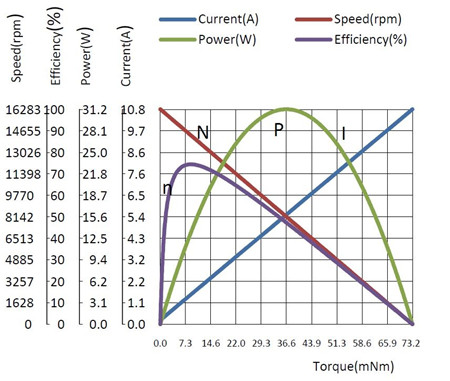電機的性能曲線以輸出轉矩為橫坐標,以轉速、電流、效率及轉出功率為縱坐標,描繪相應的曲線:轉速曲線N、電流曲線I、效率曲線?、輸出功率曲線P。